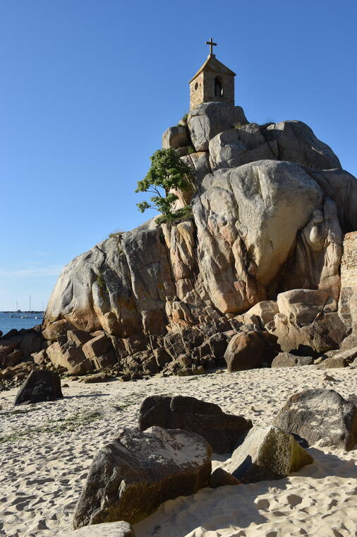 Ce rocher, coiffé d’une guérite, était utilisé par le passé pour surveiller les incursions ennemies en provenance des petites îles de la baie de Port-Blanc. Ayant été détruite, la guérite a été reconstruite au début du XX ème siècle à l’initiative de Théodore Botrel. Celui-ci y a ajouté deux statues : celle de Saint-Tugdual et celle de Notre-Dame de la mer. Au pied du rocher, le visiteur pourra découvrir une ancienne poudrière, témoin du passé défensif du lieu.